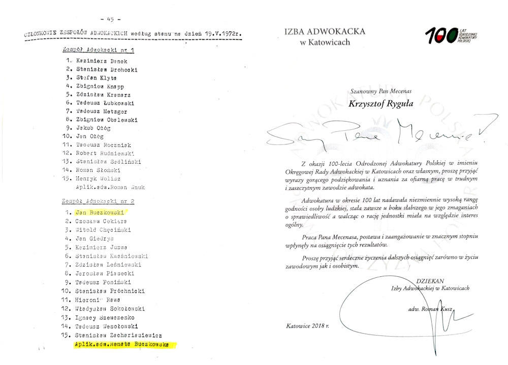Następnie do adw. Buczkowskiego dołączyła moja mama, adwokat Renata Buczkowska-Ryguła, która najpierw jako aplikantka, a później już jako adwokat, z oddaniem pomagała klientom. Gdy moją mamę dotknęła ciężka choroba, Kancelarię wraz z dziadkiem, a następnie samodzielnie, prowadził mój ojciec, adwokat Krzysztof Ryguła – od kilku lat na emeryturze, jako adwokat nie wykonujący zawodu.